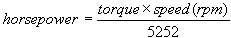 The fundamental equation to solve for rotating horsepower (HP) given torque (T in lb-ft) and speed (RPM) is: